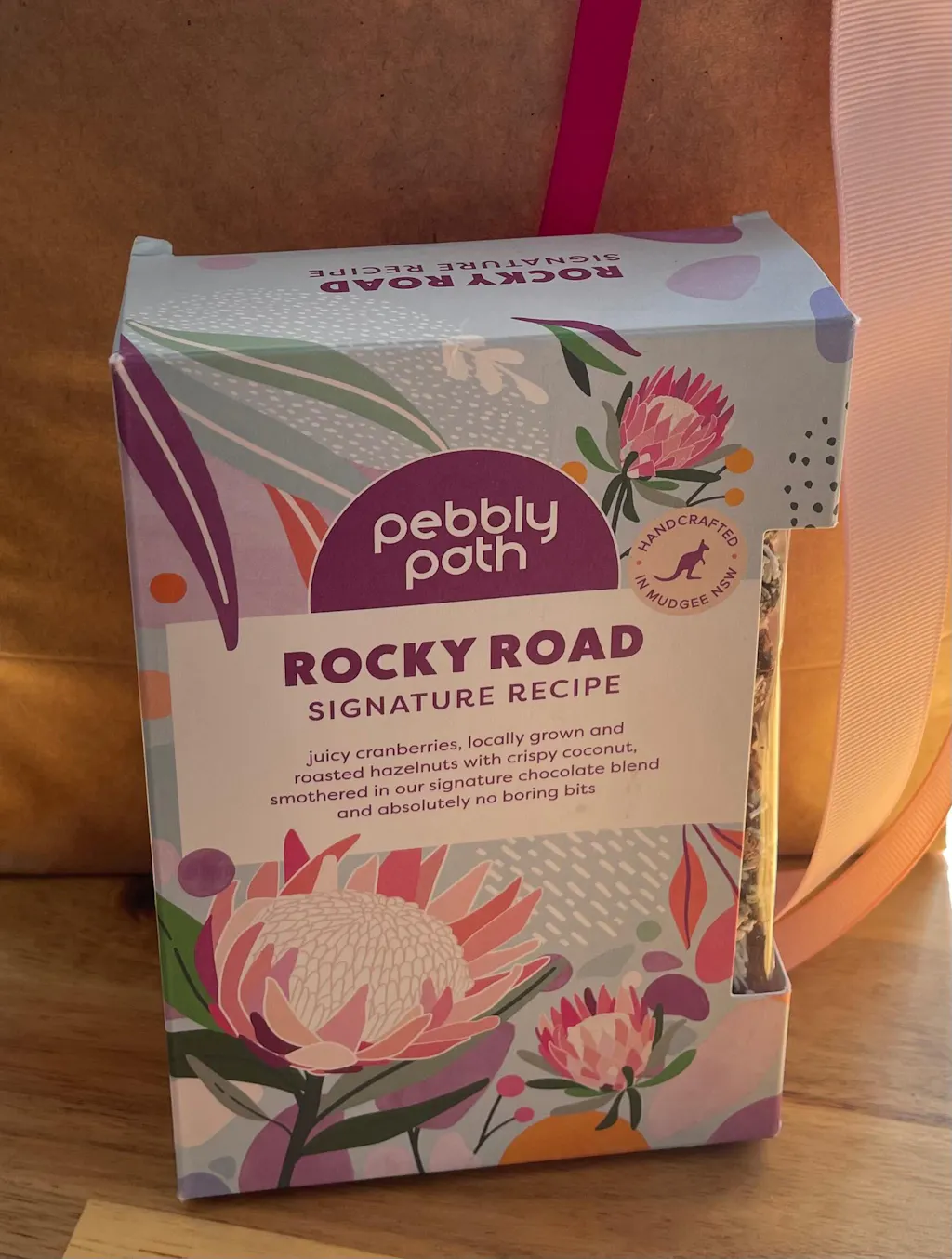 - Roasted Australian hazelnuts direct from Happy Wombats Hazelnut Farm in Batlow NSW, teamed with tart cranberries, Queensland peanuts, a heap of crunchy coconut all smothered in our Signature Recipe chocolate blend, exclusive to Pebbly Path.