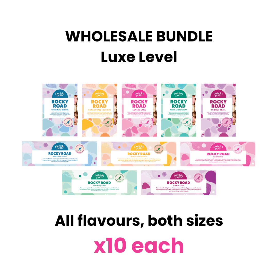 The Luxe Level bundle is for stockists who know Pebbly Path won’t be sitting on shelves for long. Designed for high-demand retailers who need a fuller restock without the admin headache, this bundle includes 10 of each flavour in both our 100g and 200g block sizes.